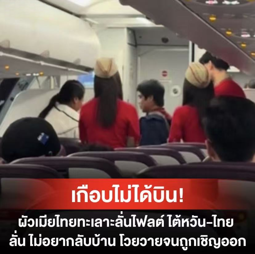 泰国头条新闻社讯 3月2日,据泰媒报道,一架原计划自中国台湾飞往泰国的航班在起飞前发生乘客争执事件。一对泰国籍夫妻在机舱内激烈争吵,机组人员评估可能影响飞行安全,最终决定请二人下机处理。 据了解,争执发生在飞机起飞前阶段。该夫妻因是否按原计划返回泰国,还是继续留在中国台湾未能达成一致意见,情绪逐渐升温。临近起飞时,丈夫突然改变主意,表示不愿返回泰国,并当场致电家人说明决定,导致机舱气氛愈发紧张。