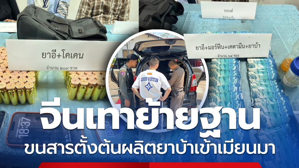 行动中,警方在县内一加油站拦截一辆可疑车辆,车内除70岁泰籍司机披提南(化名)外,还有两名中国籍男子李一腾(30岁)和马塞苗(27岁),均无法出示有效旅行证件。 经过搜查,警方在行李箱内发现209个金色瓶子,内装紫色粉末1380克、橙色粉末333.41克及64包蓝色“失身药”。经鉴定,这些均为制毒前体化学品,可用于生产冰毒、摇头丸、吗啡、氯胺酮及可卡因,黑市价值不低于300万泰铢。 初步审讯显示,披提南受雇接送两名中国男子越境缅甸,每人酬劳3000泰铢,但在行动尚未完成前即被警方拦截。三名嫌疑人将面临“外国人非法滞留泰国”及“持有第一类及第二类毒品”等指控,案件仍在进一步调查中。 |