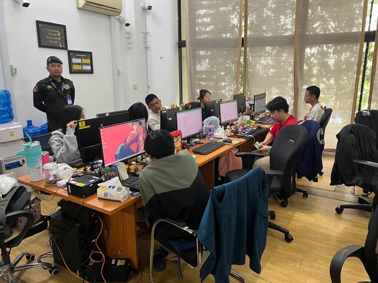 首处地点位于水净华区湄公河沿岸的Yellow Tower公寓,现场共有15名工作人员,其中女性8人,6名外籍人员均为印度尼西亚籍,均持有合法护照和签证。警方在现场查获手机16部、电脑显示器12台及主机17台。调查显示,该地点主要从事为在线游戏平台提供客户充值、提现及信息核验等客服服务,服务对象主要面向印度尼西亚市场。执法人员初步认定该场所虽未直接涉及诈骗行为,但存在为跨境网络灰产提供便利的嫌疑,正在进一步调查其关联网络及资金流向。