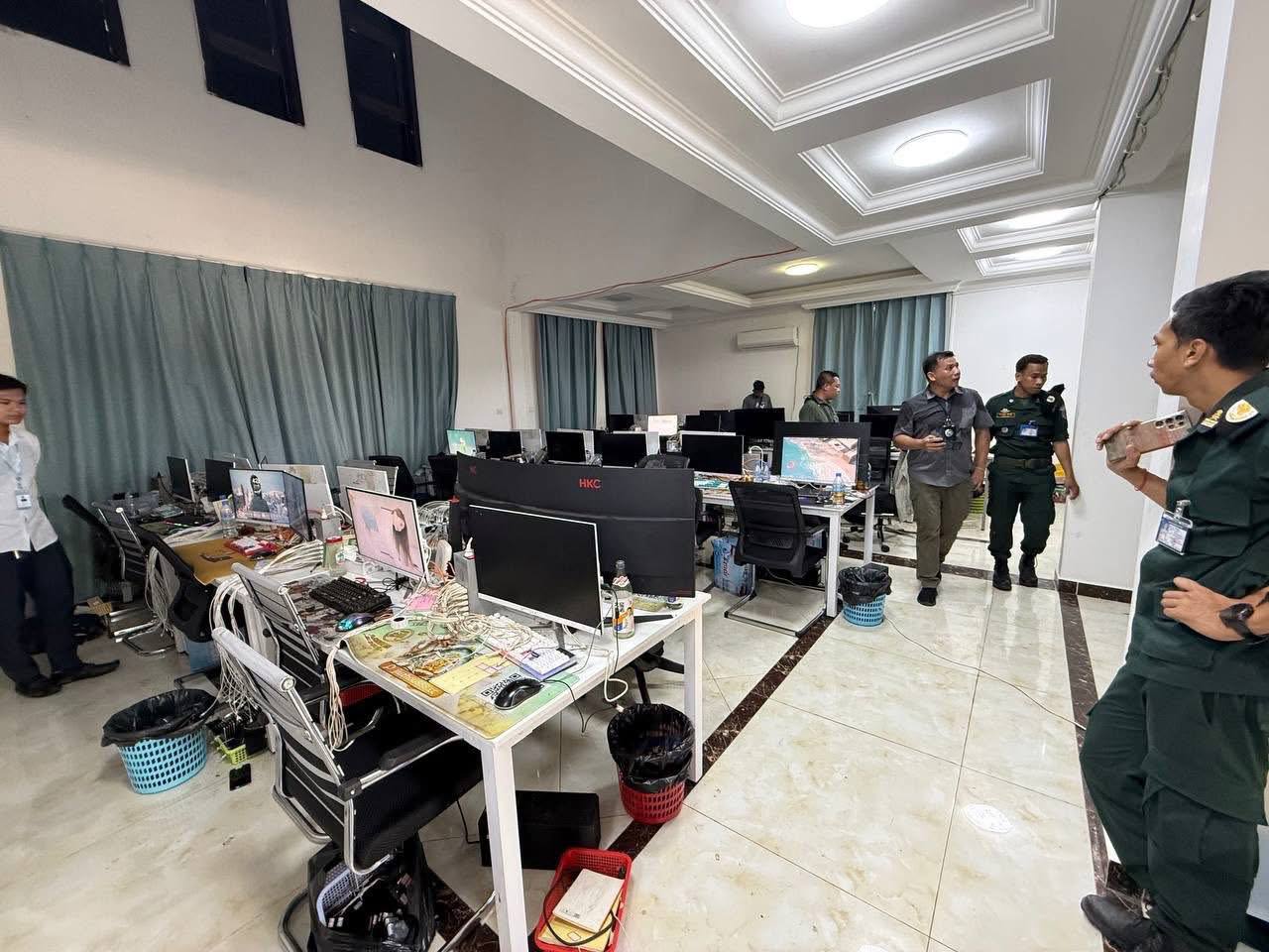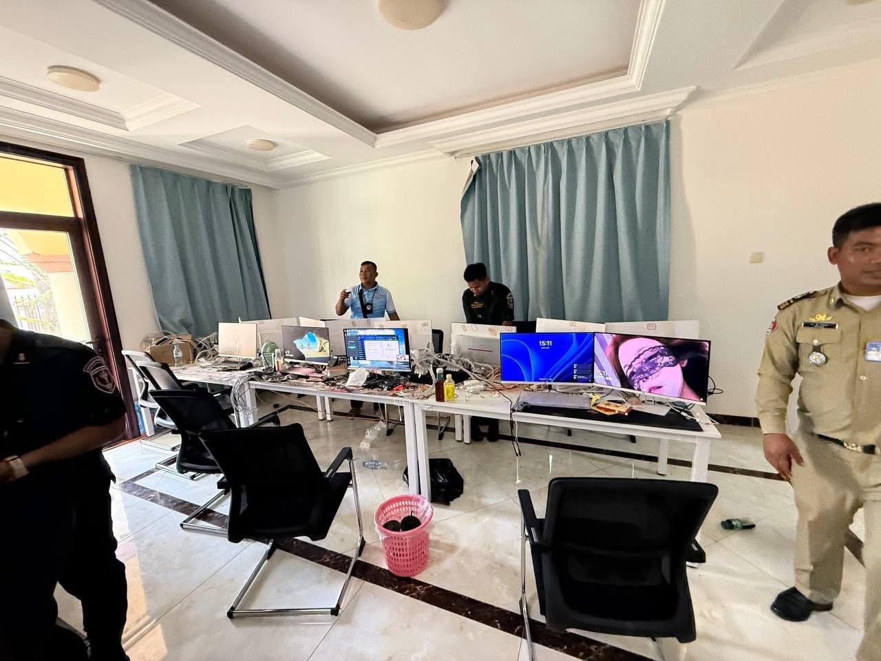 在突击行动中,执法人员控制了77名中国籍嫌疑人,并在现场查获电脑77台,以及多部手机和其他通讯设备,为调查诈骗案件提供了重要证据。此次抓捕行动显示柬埔寨执法部门对跨国电诈活动的严厉打击态度。 执法人员表示,相关嫌疑人将被移送进一步审讯,案件仍在调查中,后续将依法追究涉案人员责任,并对网络诈骗行为保持高压态势,以维护游客及居民的财产安全。