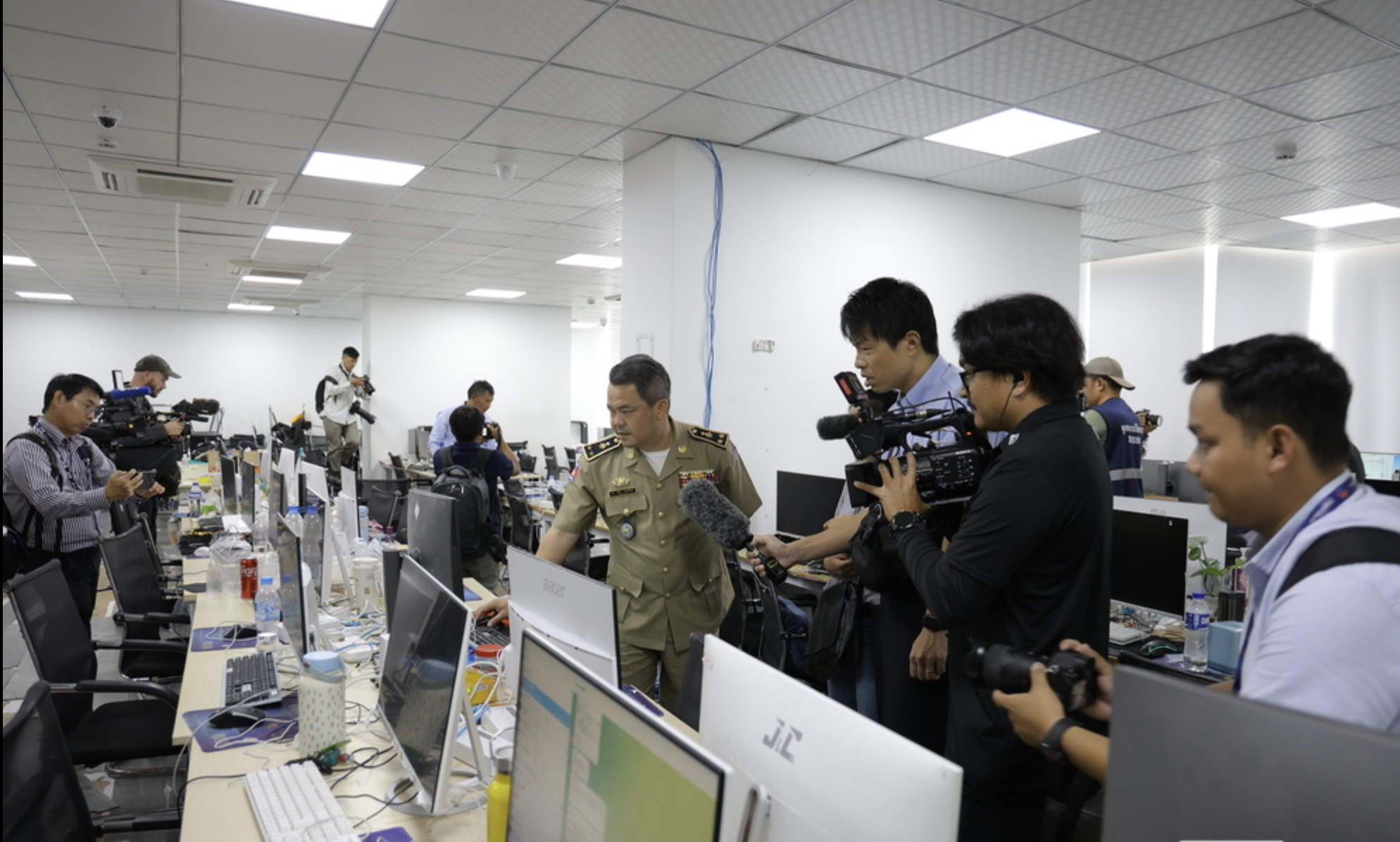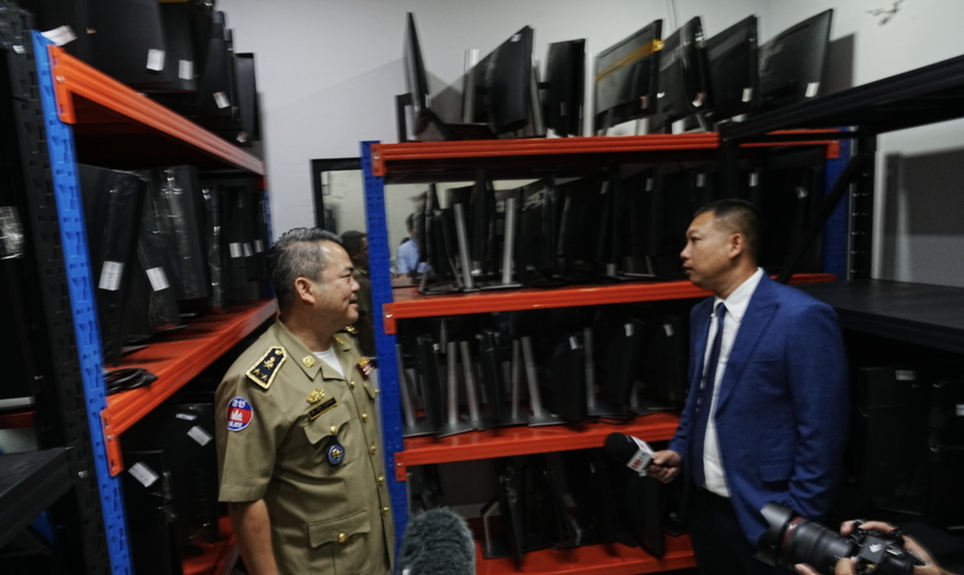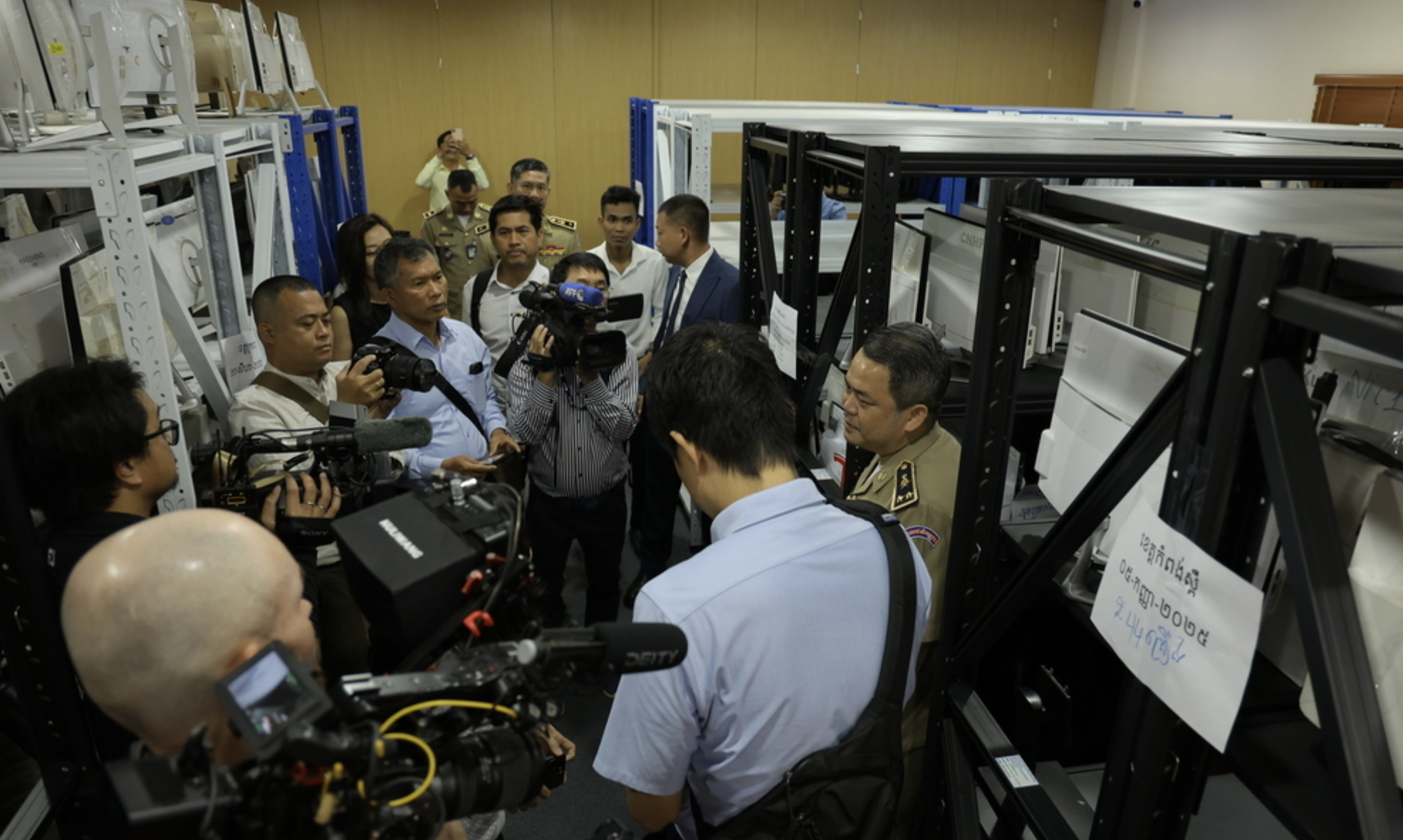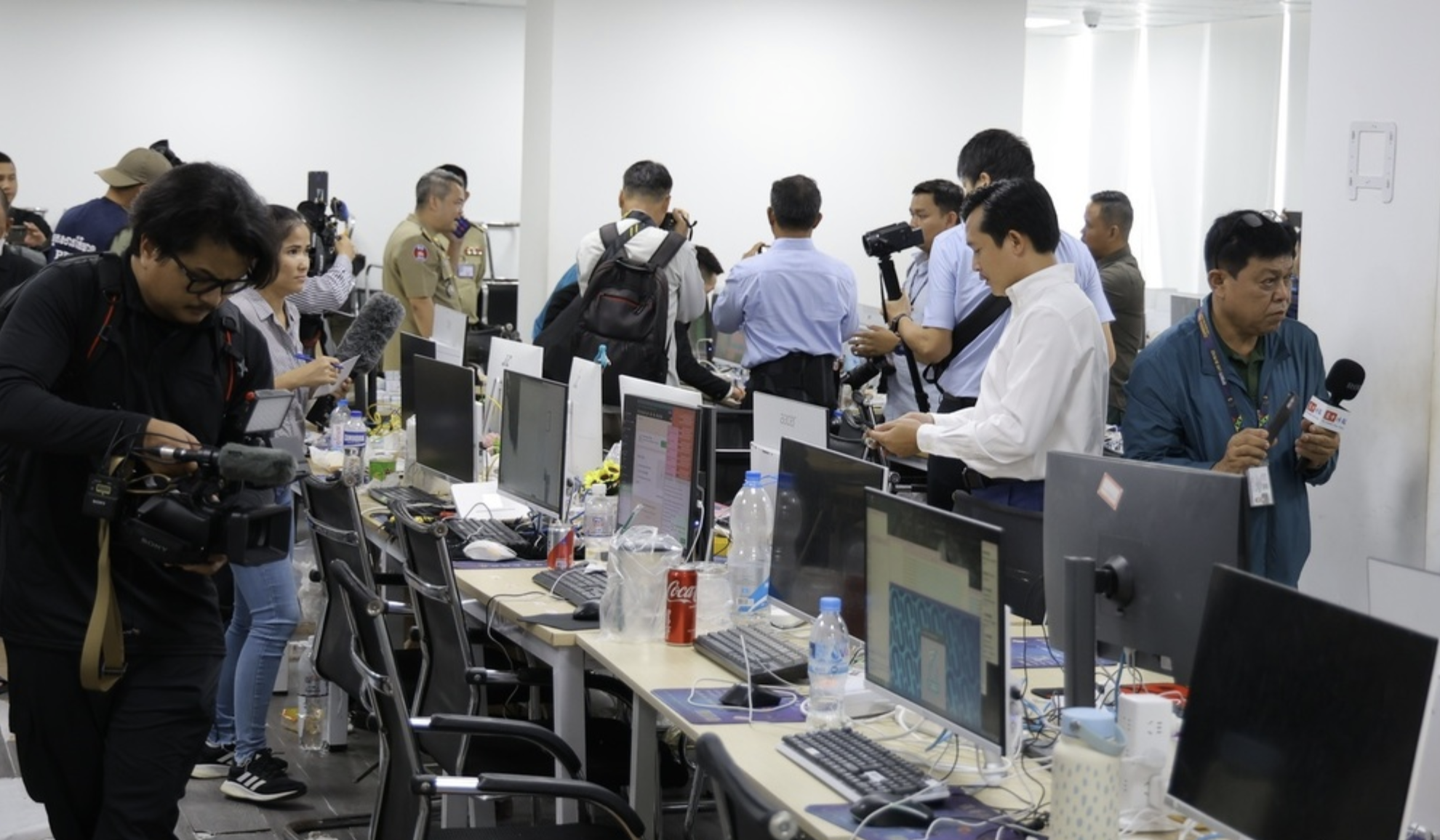 国家打击网络诈骗委员会于3月11日邀请包括《柬中时报》在内的多家媒体实地探访此前被查处的电诈窝点及证物存放地点。《柬中时报》是唯一受邀参与的本地媒体。媒体首先在委员会秘书处的安排下,前往存放证物的仓库,执法人员展示了查获的大量设备与材料,包括数百部手机、成批电脑主机和显示器,以及多种通讯设备。