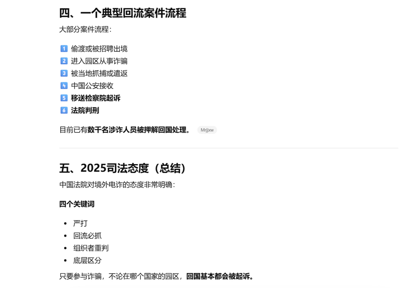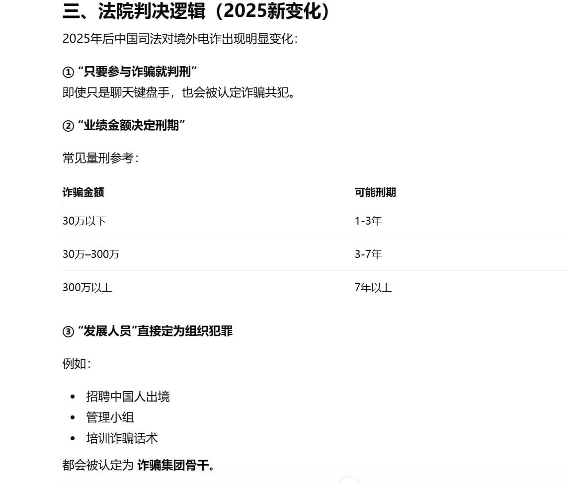 泰国华人网讯 2025年上海各区法院公开判决的境外电信诈骗案件显示,中国司法系统对参与境外电诈园区人员的打击力度持续加强,整体判罚明显趋严。即便是从犯或参与时间较短的人员,也普遍被判处1年至3年有期徒刑,并处1万至4万元罚金;若涉案金额较大或担任管理职位,刑期明显提升。 近年来,专案打击成为境外电诈案件处理的主要模式。多数案件通过境外执法合作移交,涉及整个诈骗园区,人数可达几十至上百人,调查证据较为完整。法院在量刑时重点认定诈骗金额、违法所得、组织结构及岗位分工,因此此类专案判决普遍比单独案件更重。 法院量刑核心仍依赖三个因素:职位层级、涉案金额及参与时间。普通员工一般判1–3年有期徒刑,组长或管理人员刑期可达3–7年以上;涉案金额越大,刑期越高,例如团伙涉案金额63万元或8.9亿元的案件,直接影响最终判决;参与时间越长,刑期越重,约3个月参与判1年多,4–6个月判2–3年,11个月以上可达5年以上。 综上所述,2025年的判决趋势显示,凡参与境外电诈园区、担任组织或管理职务、涉案金额巨大者,均面临明显更高的刑期及罚金处罚。这一趋势为境外电诈从业者敲响警钟,也显示出中国司法在跨境电诈案件上的严厉态度。