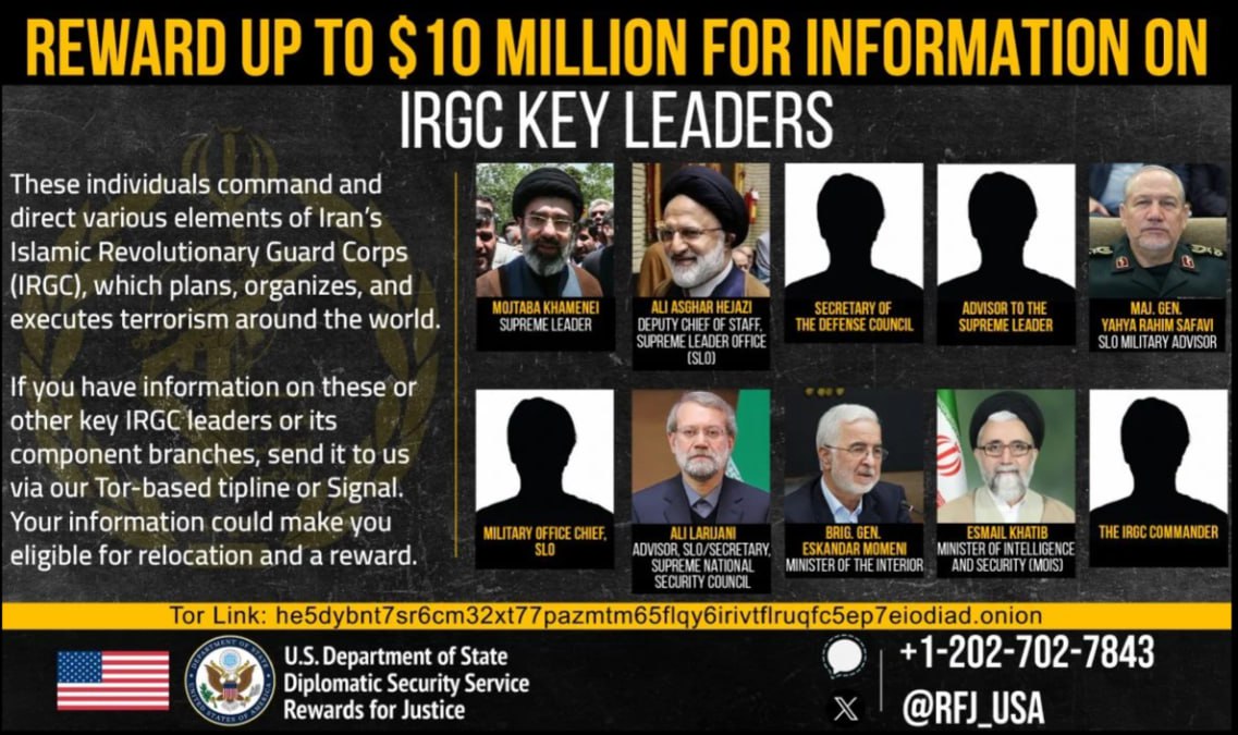 泰国华人网讯 美国国务院近日宣布,通过其“正义奖励计划”提供最高1,000万美元奖金,以征集有关伊朗部分核心人物的重要情报。这一高额悬赏被外界视为美国在当前中东紧张局势下加大情报收集力度的重要举措。 根据相关信息,此次悬赏重点关注伊朗现任最高领袖穆杰塔巴·哈梅内伊以及多名伊朗军政高层人物,包括内政部长、情报部长以及伊朗革命卫队相关高级官员。美方希望通过该计划获取有关这些关键人物行踪、活动范围以及相关网络的重要信息,并进一步掌握伊朗政府资产及导弹计划等情况。