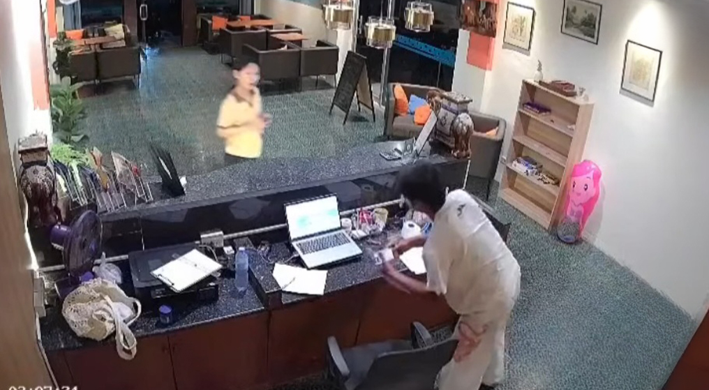 泰国华人网讯 2026年3月17日,普吉府一酒店发布安全警示称,一名外国男子凌晨闯入酒店前台,并从抽屉中取走物品,被监控录像拍下。 事发时间为凌晨3点07分,视频显示该男子进入酒店大堂,走到前台柜台后方,打开抽屉取走文件及部分财物。随后,一名女性员工发现情况并上前制止,男子立即离开现场。目击者称,该女子为缅甸籍员工。