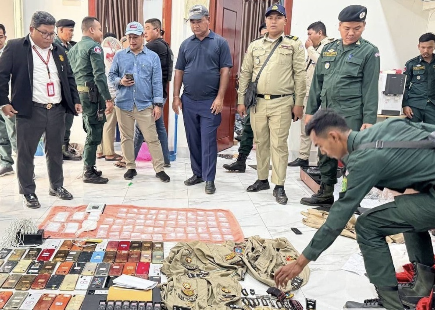 据柬埔寨打击网络诈骗委员会秘书处通报,警方在三隆通县一处民宅展开行动,当场控制相关嫌疑人。落网人员年龄介于23岁至44岁,其中包括4名女性。另有一名柬埔寨籍男子负责驾驶及看守工作。 执法人员在现场查获大量作案工具,包括手机59部、笔记本电脑7台以及录音设备8套。同时,还发现4套印尼警察制服及配套警衔、标识,初步认定该团伙利用这些装备冒充执法人员实施诈骗。