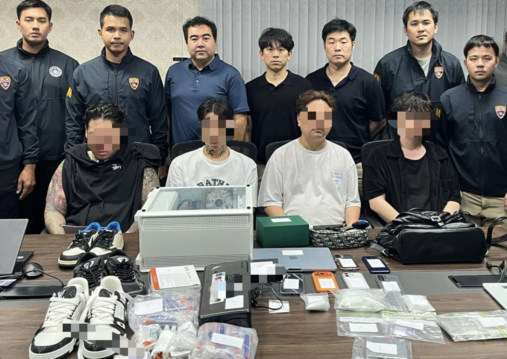 2026年3月19日上午8点30分,警方持法院批准的搜查令对该住宅实施突袭。四名韩国公民当场被捕,分别为43岁的Sim、32岁的李某、31岁的金某和31岁的徐某。他们被控持有和使用甲基苯丙胺(冰毒)、氯胺酮等毒品,并存在签证逾期或违反旅游签证停留规定的行为。其中,Sim和李某持旅游签证入境,却参与了毒品网络,被立即吊销签证;金某与徐某则均逾期居留733天。 警方在现场查获的物证包括约300克氯胺酮、约100克冰毒,以及吸毒用具、六部手机、一台笔记本电脑和一台台式电脑。此外,还缴获六件奢侈品牌商品和两张信用卡。调查人员表示,这些毒品原计划出口韩国,及时破获避免了大规模流入市场的风险。