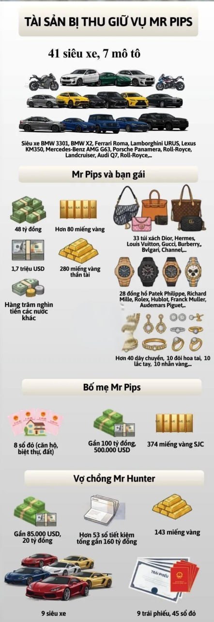 此外,警方缴获500块金条(含SJC金龙标志及吉祥金)、近200万美元现金、数千亿越南盾现金,以及31块奢侈名表,包括百达翡丽和劳力士,33个高端名牌包如爱马仕、路易威登也被查获。调查机构建议以诈骗和洗钱两项罪名对Nam起诉。 案件进一步调查显示,Nam的父亲Pho Duc Thang在其被捕后,曾用现金购黄金并寄给亲戚以转移资产。警方已临时扣押大量涉案资产,案件仍在进一步处理中。此次案件揭示了诈骗团伙通过奢华包装掩盖非法行为的手段,也凸显了越南警方打击金融犯罪的决心。