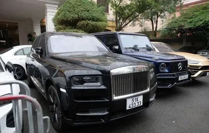 在搜查过程中,警方查获48辆交通工具,其中包括41辆汽车和7辆摩托车。不乏全球限量版超级跑车,如劳斯莱斯库里南(车牌号含四个连续3,越南上路价约400亿越盾)、法拉利Roma、兰博基尼URUS等,显示其奢华生活方式。