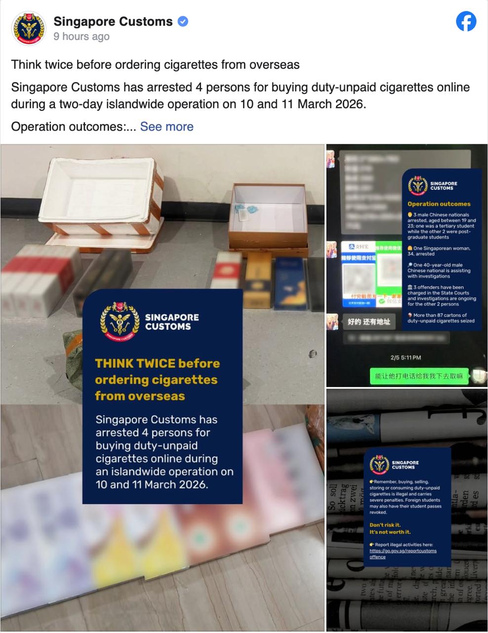 泰国华人网讯 近日,新加坡海关展开全国性执法行动,严厉打击通过网络购买和邮寄未缴税香烟的违法行为。本次行动共查获5名涉案人员,其中4人被捕,包括3名年龄在19至23岁的中国籍男子(在读学生及研究生)和1名34岁新加坡籍女子;另有1名40岁中国男子正在协助调查。 执法人员在行动中查获超过87条未缴税香烟,涉及逃税金额约1.14万新元。调查显示,涉案人员通过社交媒体平台向海外卖家购买香烟,并通过包裹形式邮寄入境。此案线索由新加坡移民与关卡局提供,为海关全国执法行动提供关键依据。