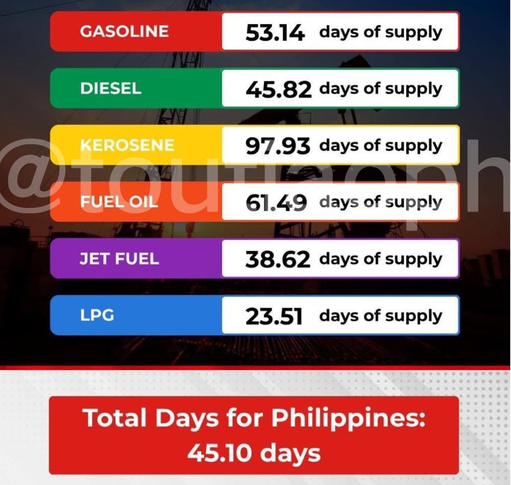 泰国华人网讯 菲律宾能源部(DOE)最新数据显示,目前全国石油供应仍处于“充足水平”,整体库存预计可维持约45天,短期内供应稳定。 根据官方公布的数据,各类燃料库存情况分别为:汽油53.14天、柴油45.82天、煤油97.93天、燃料油61.49天、航空燃油38.62天、液化石油气(LPG)23.51天。综合计算,全国平均石油供应天数约为45.10天。