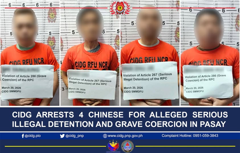 泰国华人网讯 近日,菲律宾国家调查与侦查组(CIDG)在帕赛市开展联合执法行动,协同移民局及反网络犯罪部门,成功逮捕4名中国籍嫌疑人,并解救1名被非法拘禁的中国籍男性受害者。案件涉及《修订刑法》中“严重非法拘禁”和“严重胁迫”条款。 调查显示,该受害者自3月初起被非法拘禁并遭受虐待,其求助信息经马来西亚友人转达后,引发执法部门高度关注并迅速行动。现场执法人员发现受害者被单独关押,身上有明显伤痕,并明确指认雇主为施暴者。