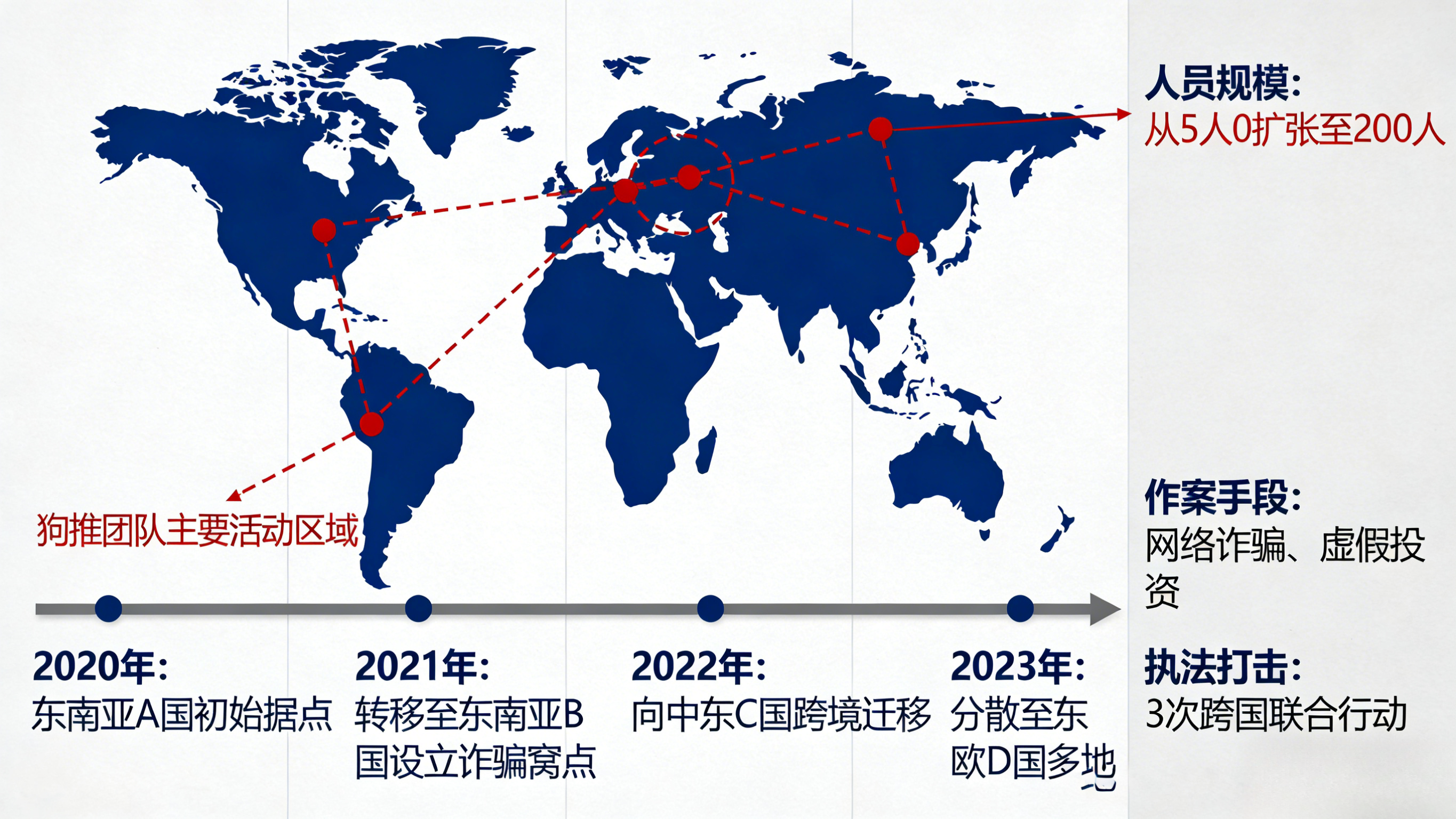 狗推团队跨境迁移轨迹 为规避执法与维持盈利,狗推及相关团队频繁迁移: • 2015-2016年:马来西亚 • 2017年:柬埔寨西港、缅甸 • 2018年:菲律宾、迪拜 • 2023年:泰国、越南、马来西亚、老挝、文莱,柬埔寨全境扩散 • 2024年:日本、新加坡、韩国 • 2025年12月:斯里兰卡 • 2026年:中东、东欧转移;2月回流本土转远程;3月全球分散小团队化 迁移规律显示,每一次移动伴随作案手法升级、团队拆分与隐蔽运作策略,形成高度分散、全球化的灰色产业网络。