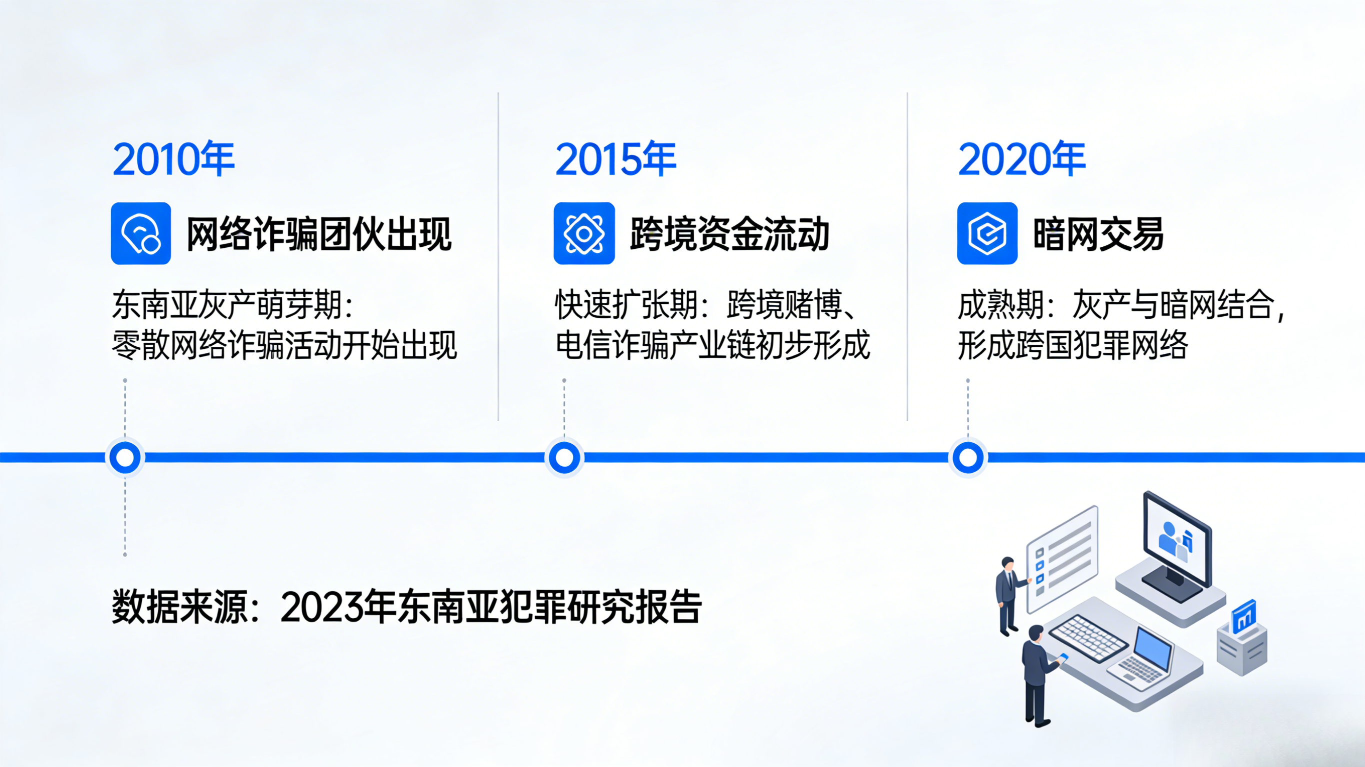 东南亚灰产发展时间线 回顾过去十年,东南亚博彩与诈骗产业逐步形成全球化灰产网络: • 2015年:博彩起点资金入场 • 2016年:洗米跑分,地下资金链成型 • 2017年:爱情诈骗刷单模式扩散 • 2018年前:A股转彩票,收割升级 • 2018年中:A股转股,资金盘成熟 • 2018年末:杀猪盘出海,全球扩张 • 2025年:博彩狗推盘体系化,盘口成型 • 2026年:金融危机冲击,资金链承压,灰产全面上升