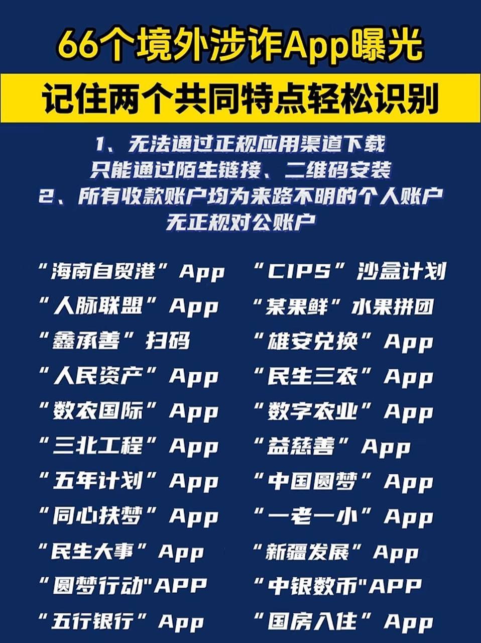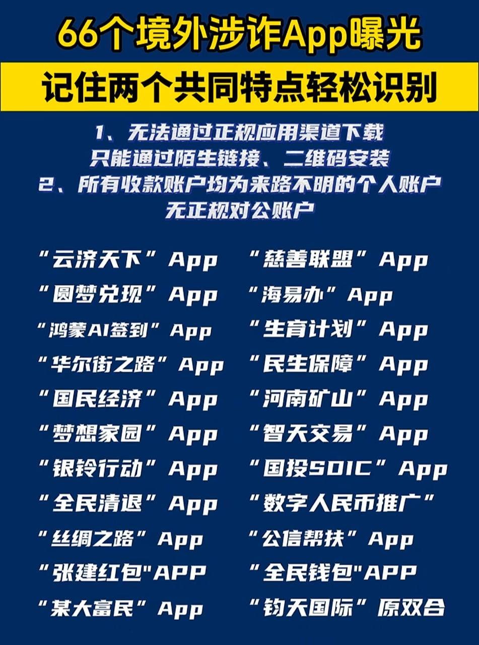 泰国华人网讯 最近,有关部门曝光了66款涉嫌网络诈骗的境外应用程序,这些App多数通过链接或二维码私下安装,无法在正规应用商店搜索到,且收款全部使用私人账户,投资者一旦上车,风险极高。 据资料显示,这些App名称看似高大上,典型包括:云济天下、慈善联盟、圆梦兑现、海易办、鸿蒙AI签到、生育计划、华尔街之路、民生保障、国民经济、河南矿山、梦想家园、智天交易、银铃行动、国投SOIC、全民清退、数字人民币推广、丝绸之路、公信帮扶、张建红包、全民钱包、某大富民、钧天国际、海南自贸港、CIPS沙盒计划、人脉联盟、某果鲜、鑫承善、雄安兑换、人民资产、民生三农、数农国际、数字农业、三北工程、益慈善、五年计划、中国圆梦、同心扶梦、一老一小、民生大事、新疆发展、圆梦行动、中银数币、五行银行、国房入住、绿色经济转型、与国同行、智慧中国、悦目AI海外版、奔小康、共信中华、复兴汇金、圆梦国网、国能、全球发展、国梦金桥、稀土稳定币、云数圆梦、中国红网、云数票房、财数信托宝、智天见面会、和衷慈协、终谷农项、环球智投。