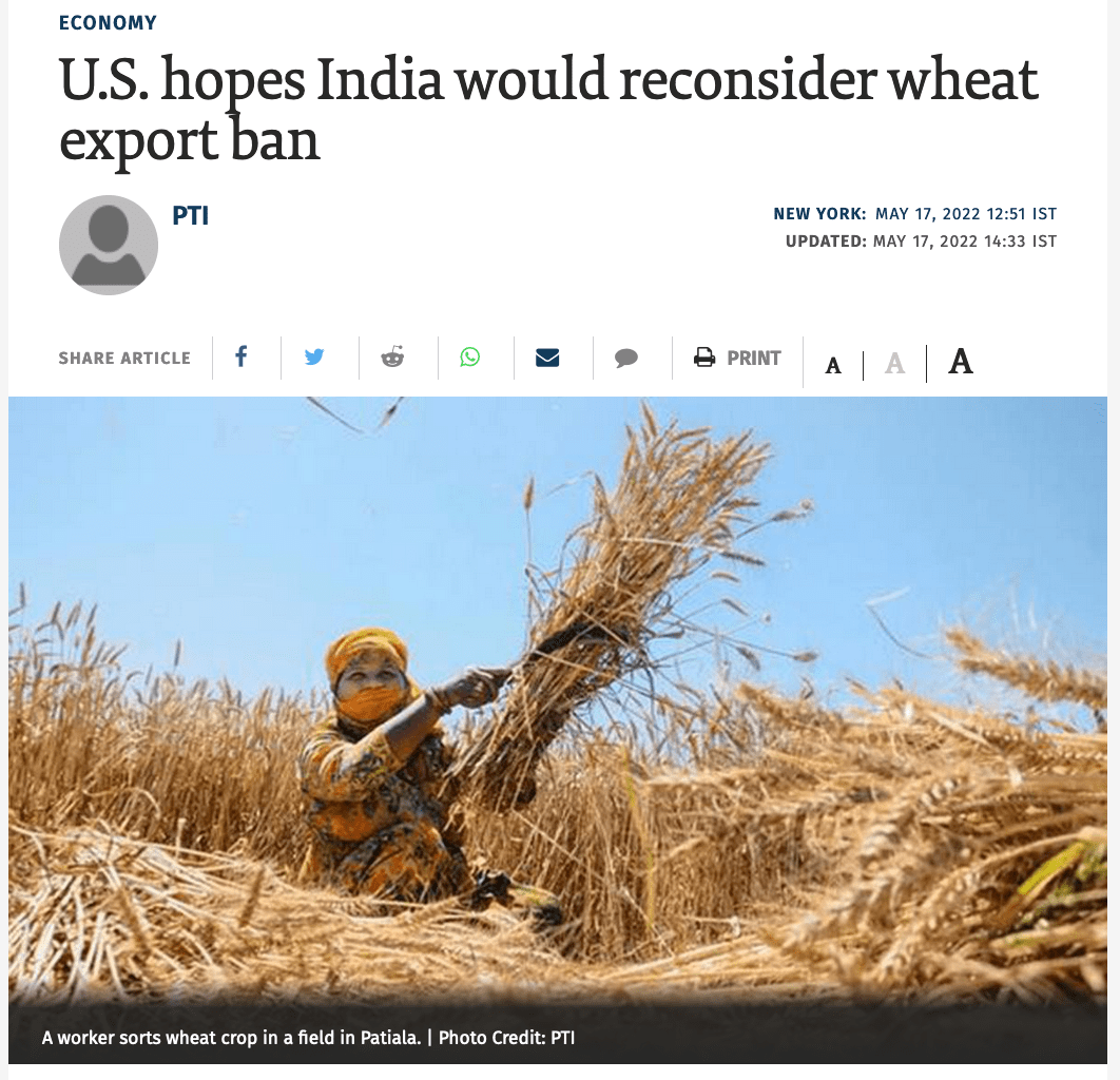 【文/观察者网 刘程辉】俄乌战火不息,西方对俄制裁步步紧逼,全球能源与粮食市场稳定遭遇重大挑战。 今年以来,全球小麦价格已上涨约60%。就在印度小麦出口禁令14日出台后,欧洲市场小麦价格16日再次攀升至435欧元/吨,创下历史新高。 围绕小麦出口政策,印度正面临着来自国内外的巨大压力。近日在德国举行的七国集团(G7)农业部长会议,对印度限制小麦出口之举进行了严厉批评。16日,美国常驻联合国代表格林菲尔德再次将话锋直指印度,施压印度能够“重新考虑”这一决定。反观印度国内,情况同样不容乐观。数月来,印度遭受了罕见的高温侵袭,粮食生产受到严重冲击。 受自然灾害等综合因素影响,全球限制粮食出口的国家远不止印度一家,土耳其、匈牙利、阿根廷等国纷纷在列,截至4月上旬已达16国。 17日,印度政府宣布再度调整小麦出口禁令,准予于5月13日或之前交海关查验并在海关系统备案的小麦出口。 美国劝印度“三思” 据《印度教徒报》17日报道,美国是联合国安理会5月轮值主席国,格林菲尔德当天是在出席纽约外国媒体中心记者会上如此表态的。她表示,美国已经注意到了印度的决定,但美国鼓励各国不要限制粮食出口,因为任何限制都将加剧全球粮食短缺的问题。