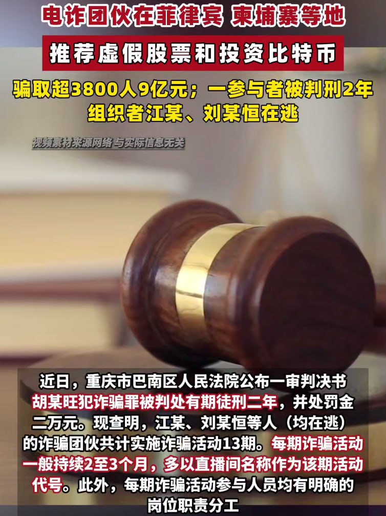 泰国华人网讯 近日,中国法院披露一起特大跨境电信诈骗案件细节。江某、刘某恒等人长期在菲律宾、柬埔寨等地组织诈骗活动,以“投资型杀猪盘”为主要手段,累计骗取3800余名受害人资金高达9亿余元。 据重庆市巴南区人民检察院指控,2019年7月至2021年5月期间,该诈骗团伙以非法占有为目的,通过招募境内人员,先后在菲律宾马尼拉、柬埔寨马德旺、金边以及湖南省某市等地设立诈骗窝点,利用电信网络实施诈骗犯罪。经查,该团伙共开展13期诈骗活动,受害者遍及全国,涉案金额巨大。