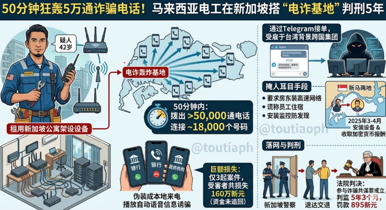 泰国华人网讯 一名马来西亚籍电工因协助跨国诈骗集团在新加坡架设“电话轰炸设备”,短时间内疯狂拨出诈骗电话,日前被新加坡法院判刑。现年42岁的嫌犯在新加坡租用公寓,安装多台VoIP通信设备,这些设备在仅50分钟内便可拨出超过5万通电话,连接约1.8万个号码,形成大规模“电诈轰炸”。 诈骗电话通过技术手段伪装成本地来电,并播放冒充银行或政府机构的自动语音信息,诱导受害者上当。警方数据显示,仅三起案件中,受害者损失就高达160万新元,资金至今未追回。