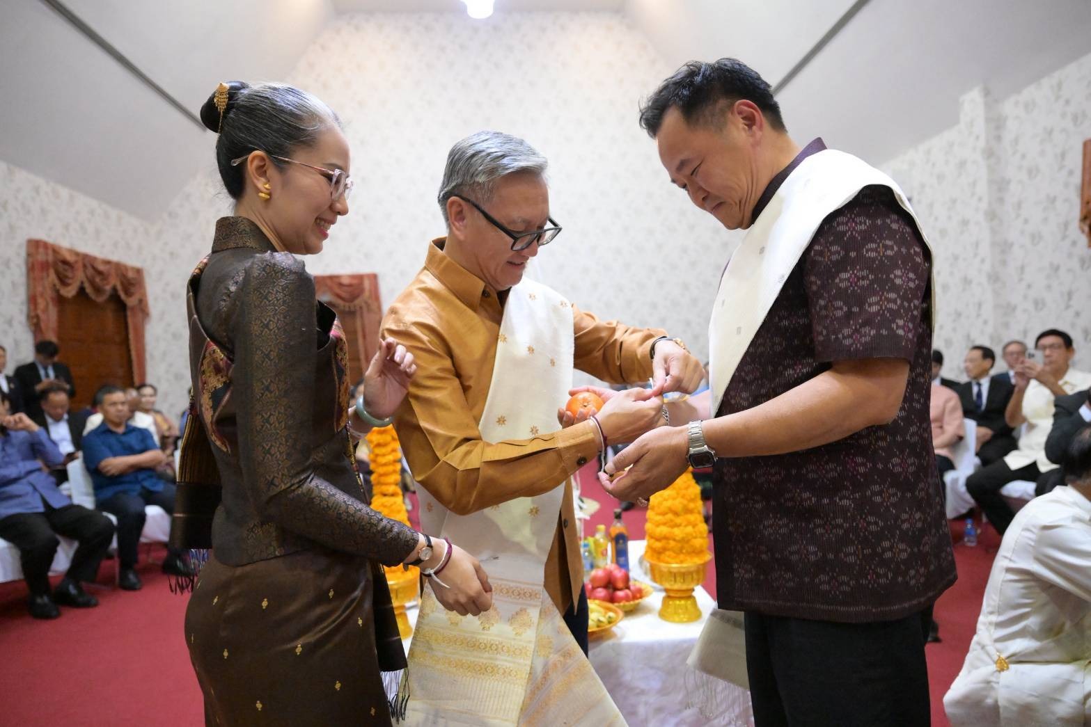 泰国华人网讯 2026年4月5日17时,泰国总理兼内政部部长阿努廷前往老挝驻泰国大使馆,出席2026年老挝宋干节新年庆祝活动。老挝副总理兼外交部部长通沙万及夫人瓦达沙纳、老挝驻泰国大使西萨瓦到场热情接待。 活动期间,阿努廷向西萨瓦赠送花瓶表达节日祝贺,并参与具有老挝传统特色的拴线祈福仪式(Baci)。该仪式通过诵经、洒圣水及系祝福线等方式,象征祈求平安吉祥,是老挝文化中极具代表性的传统礼仪。