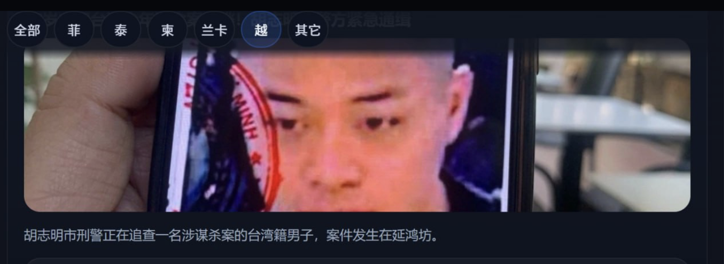 泰国华人网讯,越南警方近日发布通告,正全力追查一名涉嫌杀人案件的中国台湾籍少年。案件发生于胡志明市一处居民区,目前嫌疑人已潜逃,引发当地社会高度关注。 据胡志明市公安局刑事警察部门(PC02)通报,该案件发生于2026年3月29日,地点位于市内一条巷道。警方已就“谋杀”及“包庇犯罪”等罪名立案调查,并锁定一名外籍人员为主要嫌疑人。 经查,嫌疑人为王文良(音译:Wang Wen Liang),出生于2007年,持中国台湾地区身份。警方公布的体貌特征显示,其身高约1.65米,发型为两侧剃短,双臂及右腿有大面积纹身,具有较高辨识度。