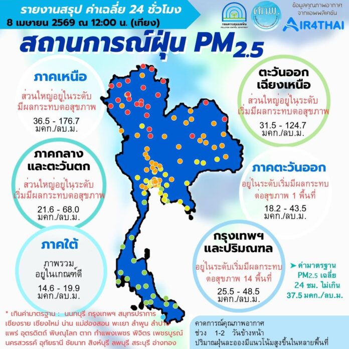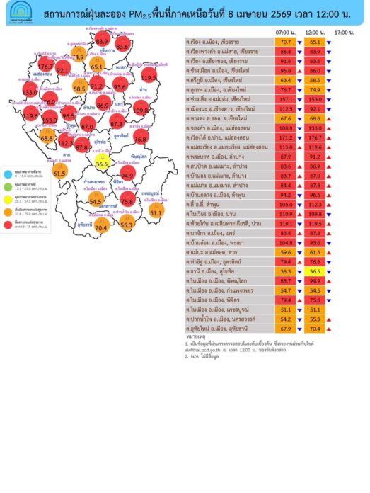 泰国华人网讯,泰国北部地区正面临严重的PM2.5空气污染问题,有毒粉尘广泛扩散,截至2026年4月8日,已有46个府发布了PM2.5超标警告,其中拜府和湄宏顺府的污染最为严重。预计即将到来的泼水节期间,空气质量可能进一步恶化,公众需保持高度警惕。 根据污染控制厅空气污染控制通讯中心(APCC)在4月8日中午12时发布的空气质量监测报告,全国PM2.5浓度范围介于14.6至176.7微克/立方米(µg/m³),远高于24小时平均标准37.5 µg/m³。北部多地尤其严重,其中清莱府、清迈府、湄宏顺府、南邦府、南奔府、楠府、帕府、帕尧府、乌达拉迪府、彭世洛府和披集府被列为红色警戒区域,表明对居民健康可能造成影响。湄宏顺府拜县威泰街道的PM2.5浓度最高,达到每立方米176.7微克。