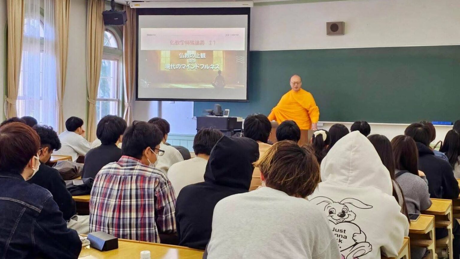 泰国华人网讯 日本京都——日本龙谷大学近日在其现代佛教研究课程体系中新增一门冥想课程,并首次邀请泰国僧侣参与跨文化学术合作,为在校学生进行系统授课,成为当地高校推动身心修习与国际佛教交流的最新尝试。 据介绍,这门名为“佛教中的止观禅修与现代正念”的课程已于第一学期开设,目前已有70多名学生报名参与。课程围绕传统佛教禅修理念展开,同时结合现代心理健康需求,吸引了不少对情绪管理与内在修习感兴趣的年轻人。 该项目由法身寺方面提供支持。法身寺通讯主任帕库·萨穆特·萨尼特翁·武提翁索表示,校方已聘请两位来自泰国的传教僧侣担任讲师,分别为栃木帕法身寺住持Phra Khru Palad Sunet Chalabhinyo,以及栃木寺法身寺住持Phra Maha Phongsak Thanio。两位僧侣将在整个学期内联合开展15场课程教学。