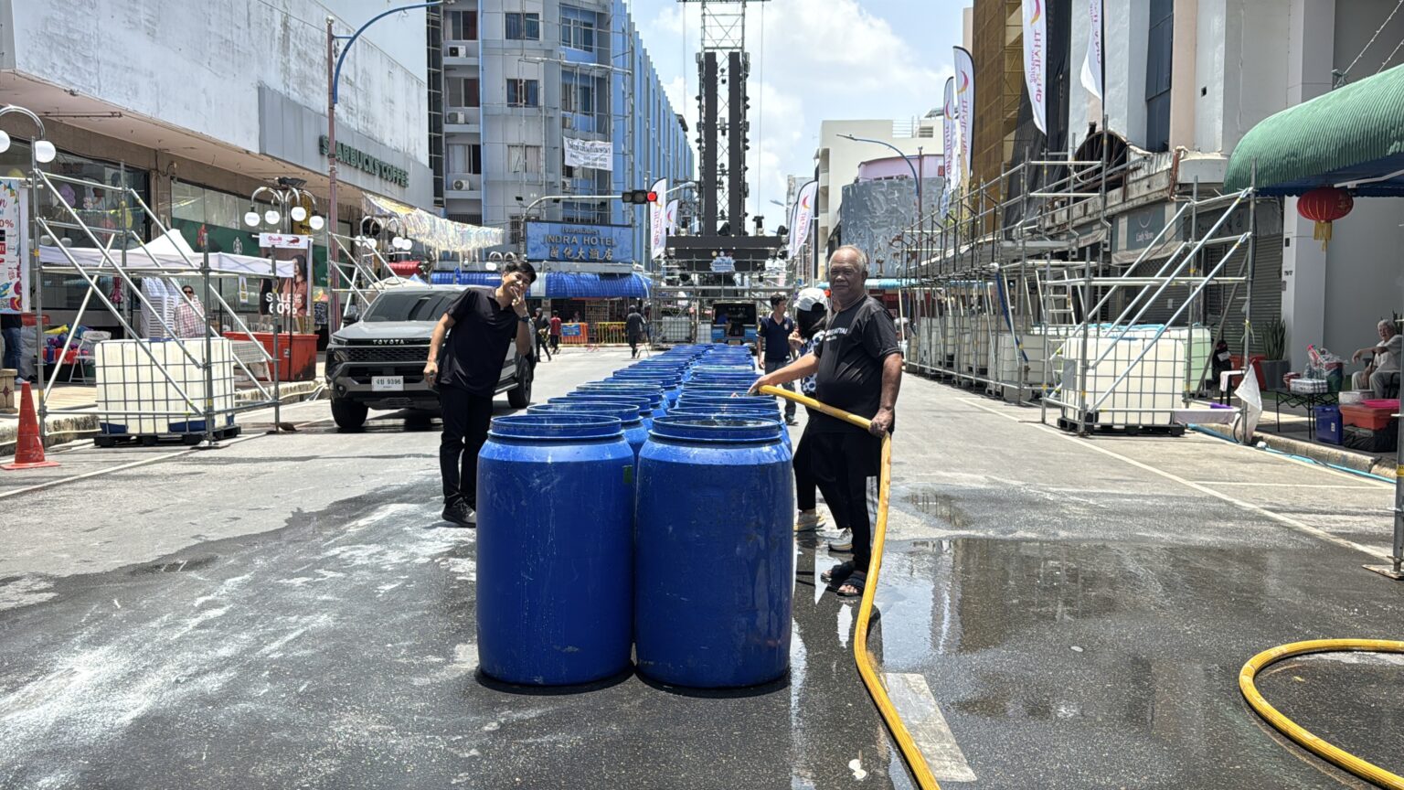 在现场,不少商贩将装满水与冰块的200升大型水箱直接摆放在显眼位置,主打“即买即用”,方便游客和参与者快速加入水战。与此同时,各类水枪、冰袋和储水容器销量明显增加,节日消费氛围浓厚。 为配合活动开展,合艾市政府提前在主要活动区域设置了200多个200升免费水箱供市民和游客使用,并设立安保指挥中心,加强巡逻与现场秩序维护,确保活动安全有序进行。