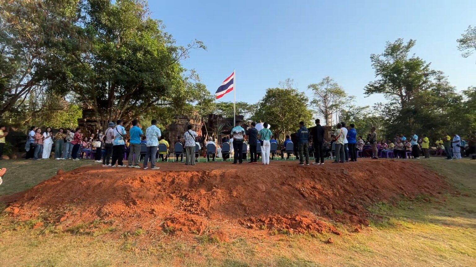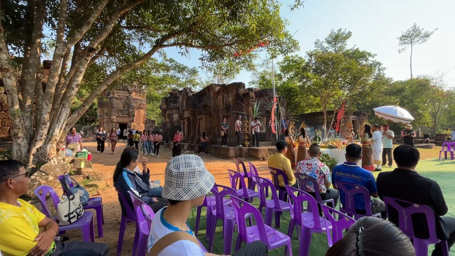 泰国华人网讯 2026年4月12日上午7点30分,素林府帕侬东乐县塔门托姆寺如期举行一年一度的传统祭祀仪式,标志着“四月参拜塔门”活动连续举办第23年。本次仪式由县长帕塔纳·蓬蓬主持,现场有地方官员、军方人员及村级代表共同出席。 据介绍,该祭祀活动属于当地延续已久的重要宗教与文化传统,通常每年都会吸引大量民众参与。然而,由于近期边境局势持续紧张,加之存在一定安全隐患,当局决定对今年活动进行严格管控。