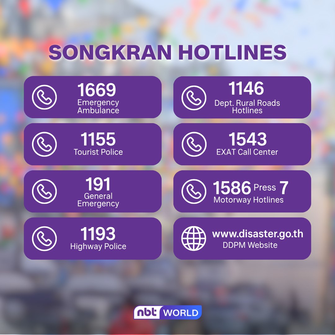 针对外国游客,官方特别强调旅游警察热线1155的重要性。该热线支持多语言服务,是在泰游客最常使用的求助渠道之一,无论是遗失物品、遭遇纠纷或需要翻译协助,均可通过该热线获得帮助。 在交通出行方面,多个部门也提供了专项支持电话。高速公路警察电话1193、乡村公路厅热线1146以及高速公路热线1586(按7)可为驾驶人员提供道路救援与事故协助;此外,高速公路管理局客服中心1543可用于查询实时路况及出行信息,帮助公众合理规划路线,避免拥堵。 与此同时,公众还可通过灾害防范与减灾部门官方网站获取最新安全信息及官方公告,及时掌握天气变化、交通状况及各类突发预警,提高出行安全保障。 官方提醒,宋干节期间道路繁忙、活动密集,事故风险相对上升,建议民众严格遵守交通法规,切勿酒后驾驶或危险驾驶,合理安排出行时间,并加强对个人财物及人身安全的防范意识。一旦发生紧急情况,应第一时间拨打相关热线寻求帮助。 在欢乐热闹的节日氛围中,安全始终是最重要的前提。提前做好准备,掌握必要的应急信息,才能在尽情享受宋干节的同时,确保自身与家人的平安。 |