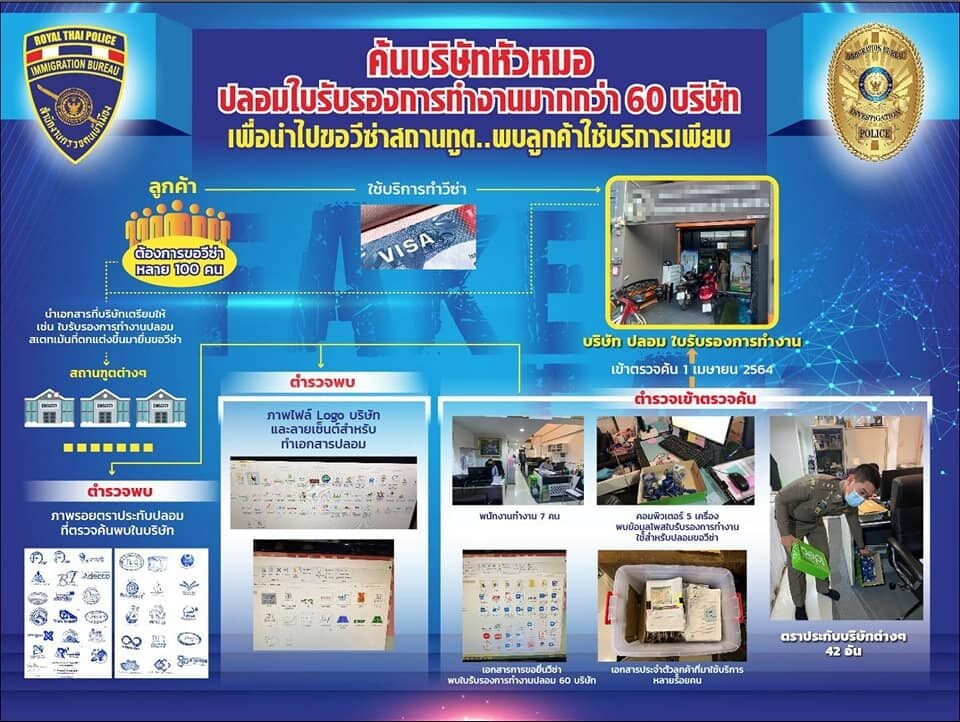 据泰国移民局报告,他们突击检查了一家曼谷公司,该公司涉嫌为想出国工作的泰国人提供假文件和签证。其中包含给大使馆的假文件和用于申请在外国超60家公司工作的假工作许可证。 七名泰国员工在该公司的办公室被逮捕。警方还查获了42个假标志印章,5台电脑,100份申请签证的伪造文件,以及向外国公司申请的假工作许可证。 该公司管理层表示,他们推出这项业务并在网上做广告,以吸引需要签证到海外工作的泰国客户的注意。制作假文件的费用根据海外工作国家的不同而不同。 |