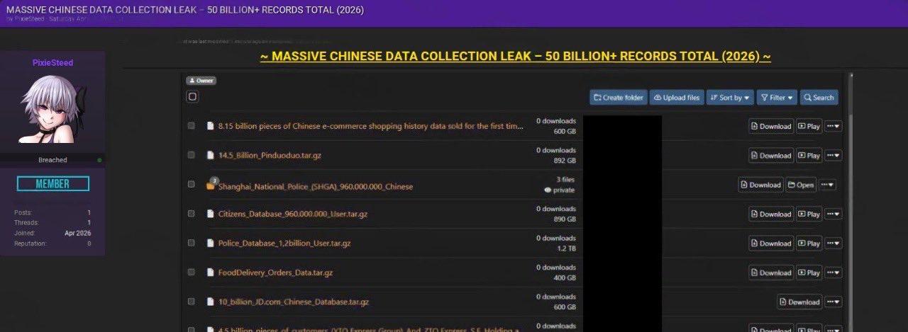 泰国华人网讯 近日,网络安全领域传出一则引发广泛关注的消息:一个据称包含超过500亿条记录的数据合集,被发布在某知名网络犯罪论坛上,引发外界对大规模数据泄露风险的讨论。 据相关帖文描述,该数据合集被整理为多个大型数据集,内容涵盖中国多个电商平台、物流企业及公共信息数据库,整体规模被称为“高价值数据集合”。 其中包括约145亿条拼多多客户记录及购物历史数据,文件大小约892GB;约100亿条京东用户数据库,约600GB;以及81.5亿条电商购物历史数据,同样约600GB。