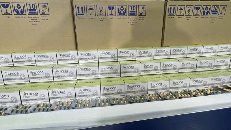 警方经过数月调查,于2026年3月18日联合食品药品监督管理局及地方卫生部门,对三处重点地点展开同步突袭。在曼谷孔三瓦区一处仓库内,执法人员查获1560万粒曲马多胶囊,以及124,000瓶液体抗过敏和止咳药、4,160,000片镇痛类药物及相关分装设备和文件。 在曼谷农卓区一栋注册为批发企业但未实际运营的建筑内,警方查获三批共计4,375,800粒可待因(Comadol)胶囊,这些药品被记录为已销往外府药店,实则被隐藏囤积。
