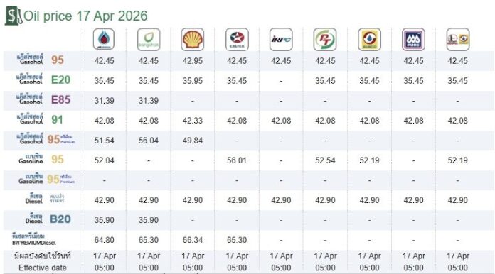 | 泰国华人网讯 2026年4月17日,泰国能源部能源政策与规划办公室(EPPO)发布最新燃油价格报告称,当天上午共有5家主要加油站下调油价,涉及多个常用油品,市场关注度迅速升温。 此次公布的加油站包括 PTT、Bangchak、PT、Shell 以及 Caltex,均为泰国主流燃油供应商。 根据最新数据,各大油站油价如下: PTT加油站方面,95号汽油醇为42.45泰铢/升,E20为35.45泰铢/升,E85为31.39泰铢/升,91号汽油醇为42.08泰铢/升;95号优质汽油51.54泰铢/升,95号汽油52.04泰铢/升;柴油42.90泰铢/升,B20柴油35.90泰铢/升,优质柴油64.80泰铢/升。
