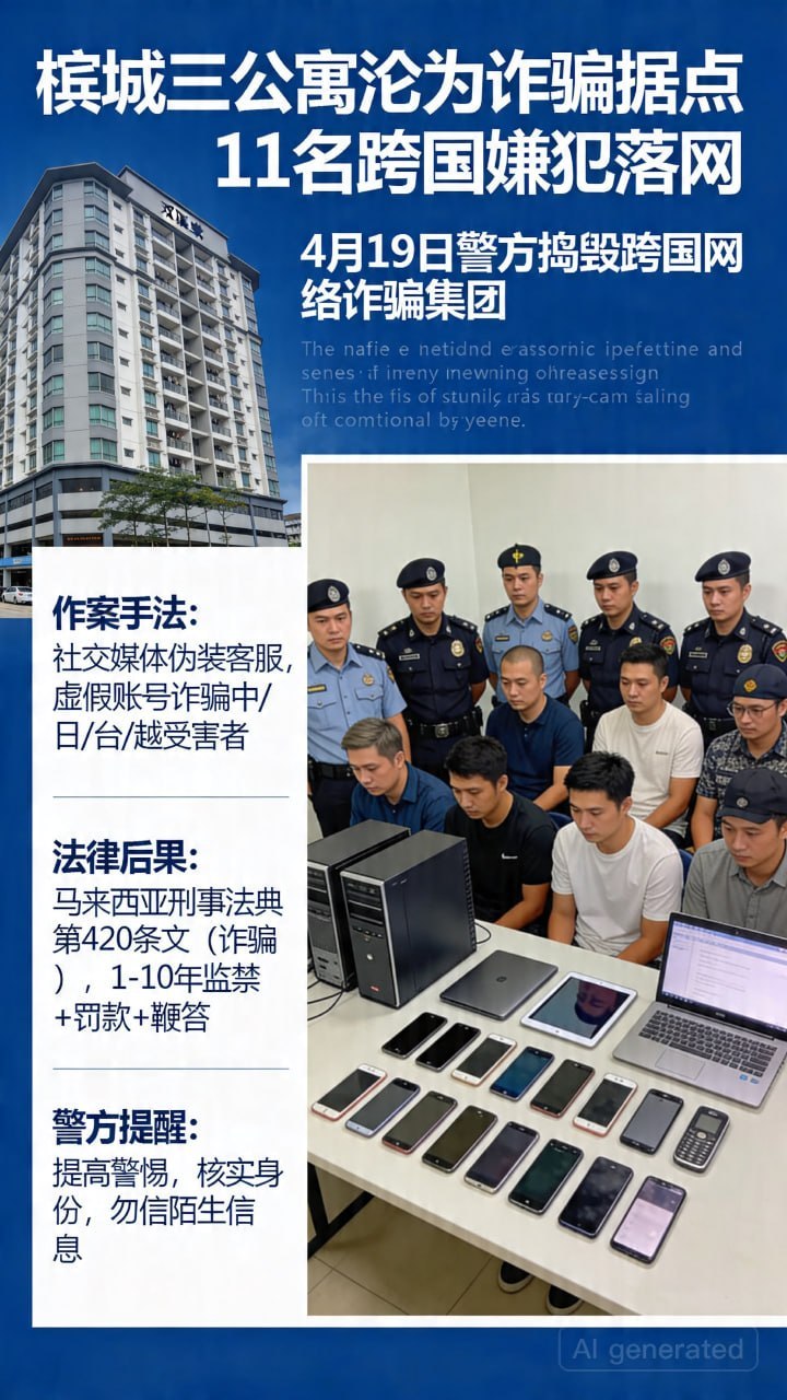 泰国华人网讯 马来西亚槟城警方近日成功捣毁一个设于公寓内的跨国网络诈骗集团,在双溪里蒙一带三间公寓单位内查获并逮捕11名嫌犯,涉案人员来自多个国家,案件呈现明显跨境犯罪特征。 据槟州警方通报,该诈骗集团以公寓为掩护,将住宅单位改造成“呼叫中心”,通过互联网远程实施诈骗活动。警方于4月17日展开至少两次突击行动,最终成功瓦解该犯罪网络。 槟州总警长拿督阿兹兹表示,此次落网的11名嫌犯年龄介于21岁至56岁之间,成员包括中国、台湾、越南、日本及马来西亚籍人员,显示该集团具备明显的跨国组织结构与分工体系。