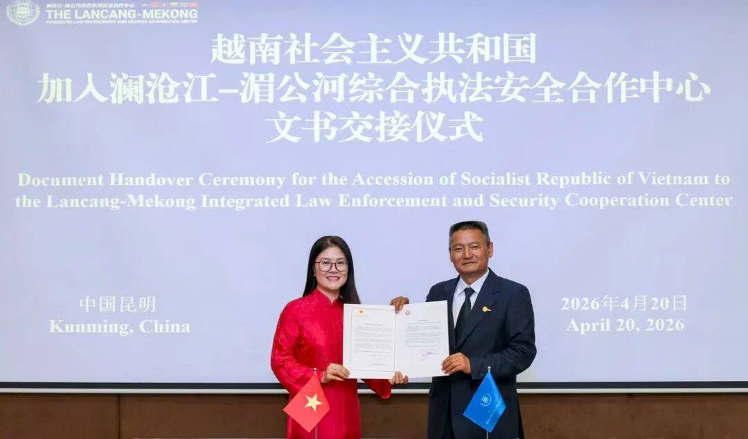 泰国华人网讯 近日,在各成员国共同支持与推动下,越南政府正式加入澜沧江—湄公河综合执法安全合作中心,标志着该区域多边执法合作机制进一步扩展与完善。 4月20日,越南驻昆明总领事严越钟在澜湄执法合作中心秘书处,向尤小文秘书长正式移交越南外交部部长黎怀忠签署的《加入书》,以及越南公安部部长梁三光签署的关于加入《关于建立澜沧江—湄公河综合执法安全合作中心的谅解备忘录》的《声明》。相关文件的正式递交,意味着越南完成加入该机制的法律与程序确认。