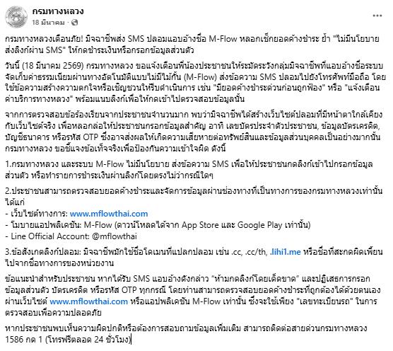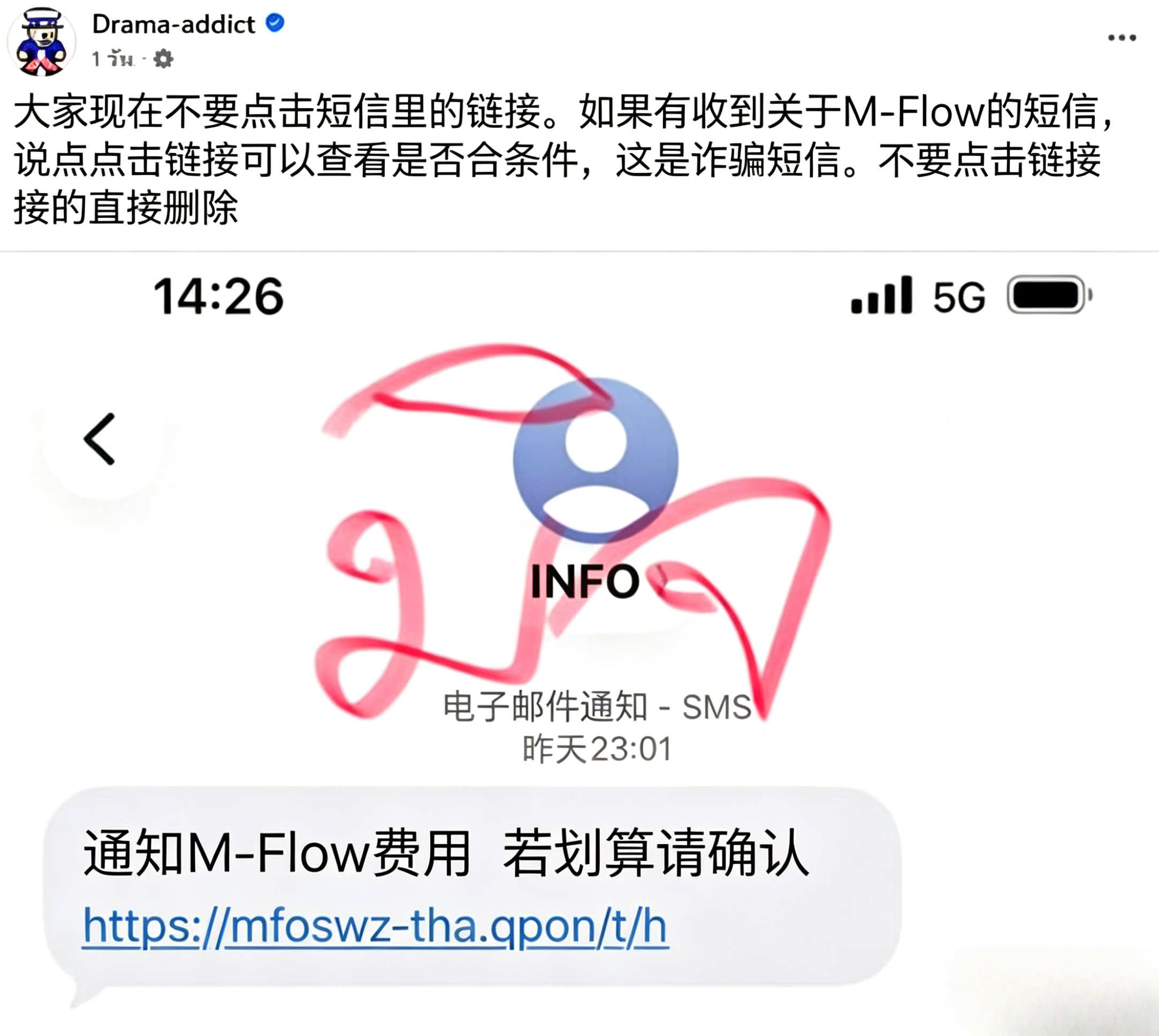 泰国华人网讯 近日,一种新型短信诈骗在泰国境内频繁出现,不法分子冒充高速公路收费系统“M-Flow”发送“未缴通行费”通知短信,并附带钓鱼链接,诱导民众点击付款或输入个人信息,已引发大量用户受骗风险。 据多家社交媒体及热门脸书页面曝光,这类诈骗短信以“高速通行费欠缴”“账户异常扣费”等名义,制造紧迫感,诱导用户点击短信中的链接。一旦用户进入虚假网站,个人银行卡信息、身份资料甚至验证码都有可能被套取,进而造成资金损失。