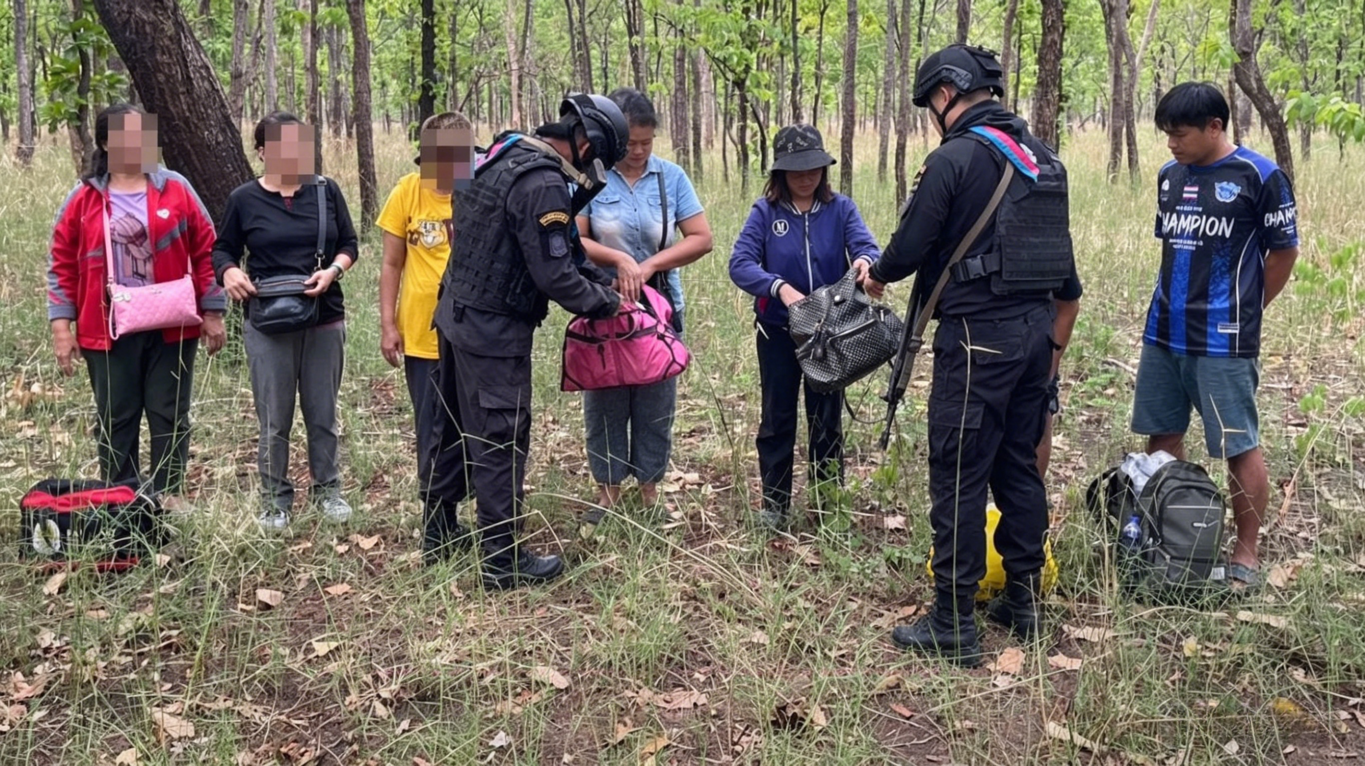 泰国华人网讯 4月25日,泰国沙缴府亚兰县边境巡逻部队在例行巡逻中,查获7名非法越境的泰国公民,这些人员涉嫌被诱骗前往柬埔寨波贝地区,为跨境诈骗集团开设银行账户,目前已被依法逮捕并展开进一步调查。 据亚兰特遣队指挥官柴纳隆·卡西上校及第12游骑兵团指挥官蓬萨空·苏昂甘上校部署,第1202游骑兵连与情报部门联合在责任区域展开巡逻,重点防范非法出入境及跨境犯罪活动。巡逻过程中,执法人员在沙缴府亚兰县帕莱街道5号村附近,发现一批人员从柬埔寨方向步行入境,行为可疑,随即上前盘查。 经确认,该批人员共7人,均为泰国籍公民,其中2男5女,且未持有有效护照。初步审讯显示,这些人员通过求职网站看到“出租银行账户”广告,对方承诺每个账户可获得约15000至25000泰铢报酬,随后被诱骗前往边境地区。