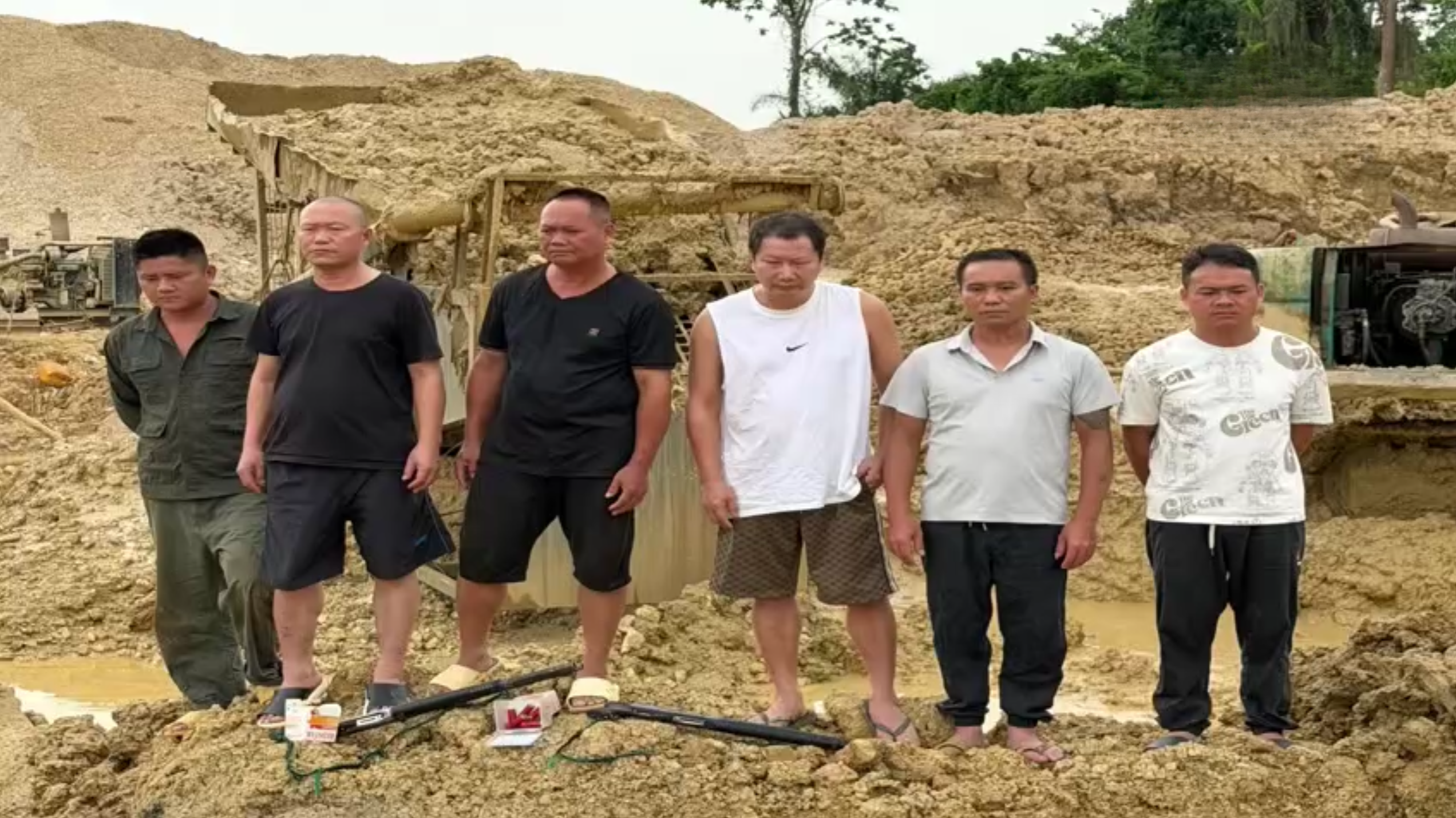 在随后的搜查中,执法人员发现两支霰弹枪及共计102发子弹,同时查获一辆丰田Tacoma越野车,以及多本护照和身份证件。此外,在现场一个黑色塑料袋内,还发现约6万加纳塞地现金,全部被执法人员依法扣押。 行动进一步升级后,执法队对整个非法采金设施进行清理与破坏。现场两台挖掘机被强制拆除控制面板及液压系统,一座金属淘金平台被当场拆毁,木质淘金台、抽水机、发电机及水管等设备也被一并销毁或没收,以防止再次投入使用。