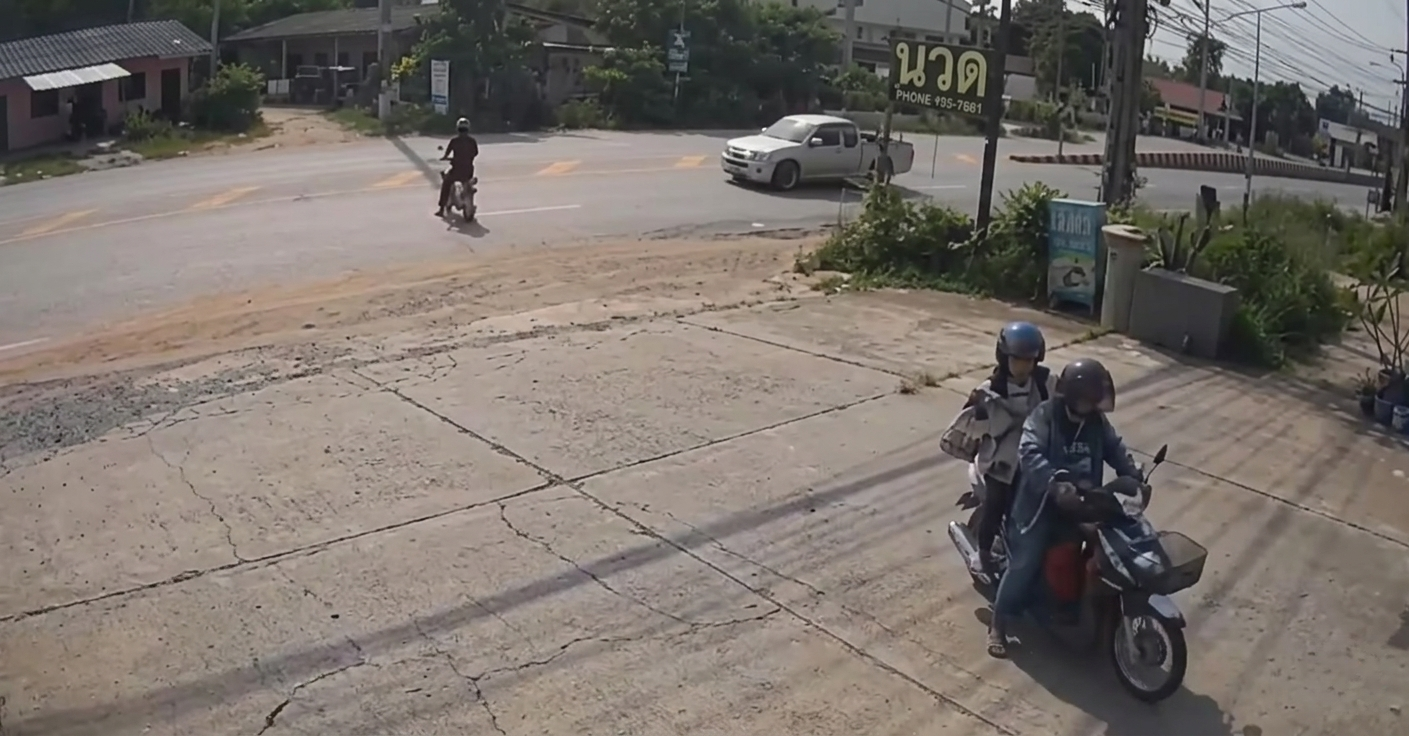 泰国华人网讯 2026年4月26日,泰国罗勇府发生一起交通事故,一名58岁的中国男子在骑电动自行车横穿马路时,与一辆直行皮卡车发生碰撞并受伤,事故全过程被路边商铺监控清晰记录,引发关注。 事故发生在罗勇府普鲁艾登县(Pluak Daeng)通往糖厂路段附近。监控画面显示,该男子从一家传统按摩店门前骑出电动车,准备横穿马路返回对面住处。起步后,他先向左侧观察来车情况,在骑行至道路中间时才转头查看右侧,但此时一辆皮卡车已从右侧方向正常直行驶来。 尽管皮卡司机在发现情况后第一时间采取紧急制动措施,但由于双方距离过近,仍无法避免碰撞。车辆直接撞上电动车,导致该男子连人带车被撞飞,电动车与人员分离,现场冲击力较大。