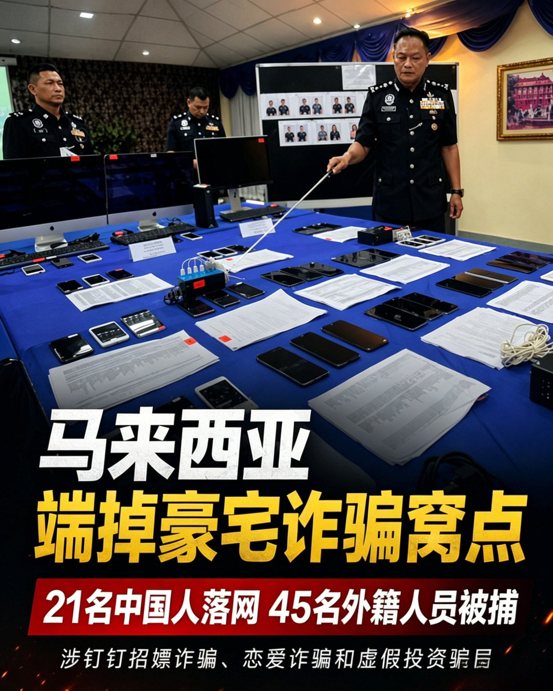 泰国华人网讯 2026年4月28日,马来西亚马六甲警方通报,执法部门近日在当地住宅区同步突袭两栋豪宅,成功捣毁疑似跨国网络诈骗据点,共逮捕45名外籍人员,案件涉及虚假色情服务诈骗、恋爱诈骗及虚假投资骗局,整体运作模式呈现出明显的分工化与组织化特征。 行动发生于4月23日上午约11时,由马六甲州警方统一部署展开。州总警长祖凯里·慕赫塔尔表示,警方首先突袭第一处豪宅,在现场逮捕21人,其中包括20名中国籍人员及1名印尼籍女子。 在该窝点内,警方查获3台笔记本电脑、62部手机、1套路由器及调制解调器、18份诈骗话术脚本,以及8本护照等物品。初步调查显示,该团伙主要通过“钉钉”等通讯工具,向中国境内受害者发送所谓“色情服务”信息进行引流,但实际并不存在任何真实服务,属于典型的虚假招嫖诈骗模式。