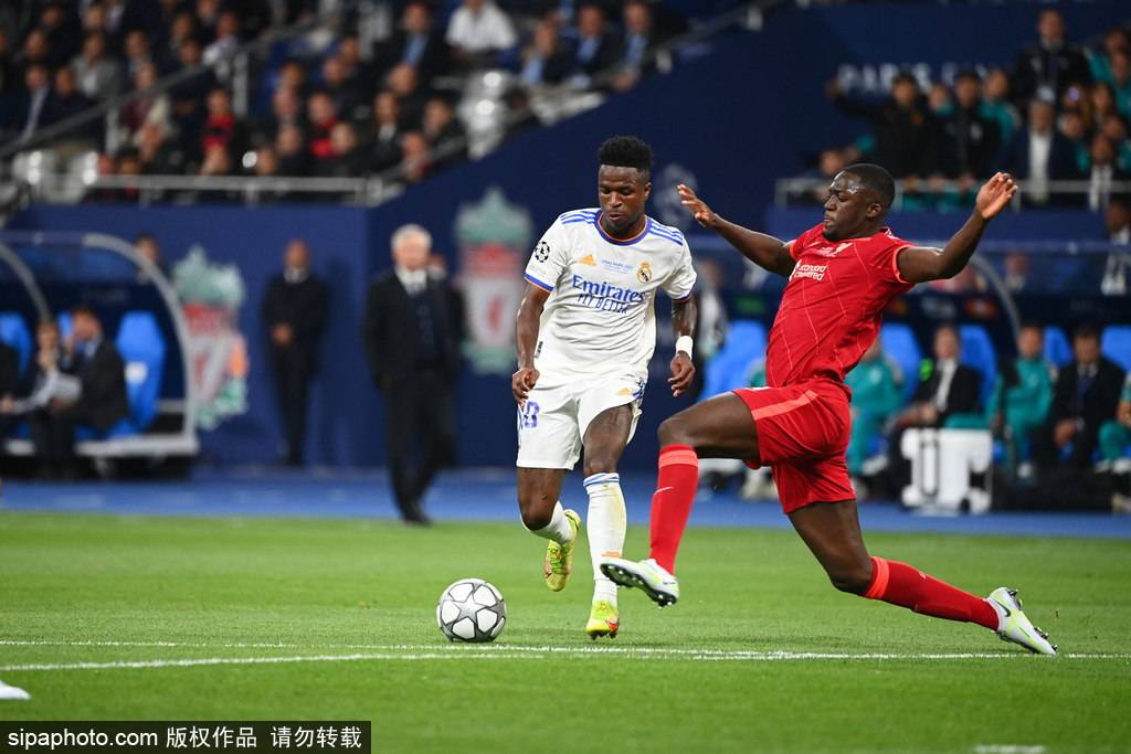 北京时间5月29日凌晨03时36分,2021-2022赛季欧冠决赛在法国首都巴黎法兰西大球场打响,利物浦对阵皇马。经过90分钟鏖战,皇马1-0击败利物浦,夺得了本赛季欧冠冠军,实现了联赛、欧冠和西班牙超级杯三冠王,这也是银河战舰队史第14个欧冠冠军。全场唯一进球出现在第59分钟,巴尔韦德助攻维尼修斯打进制胜球。此外,马内有一脚射门击中门框,本泽马有一个进球被判越位。 由于现场球迷没有没能及时进入法兰西大球场,这场欧冠决赛被迫延迟36分钟进行,开赛时间变成北京时间5月29日凌晨03时36分。欧冠决赛开始前,欧足联和组办方在法兰西大球场安排了一场短暂的开幕式。 开赛仅2分钟,利物浦获得一个前场任意球,但阿诺德尝试传中未能形成威胁。第14分钟,罗伯逊禁区左侧传中未能找到队友,门迪胸部将皮球停给库尔图瓦,进而终结了利物浦进攻。第16分钟,利物浦对皇马形成了围攻,阿诺德禁区右侧传中,萨拉赫前点抢射被库尔图瓦扑出,随后马内做球,迪亚斯点球点左侧射门被防守球员阻挡,此后罗伯逊再次做球,蒂亚戈禁区弧顶再射被库尔图瓦没收。第18分钟,马内禁区左侧横传,萨拉赫点球点前射门被库尔图瓦没收。第19分钟,萨拉赫回做,阿诺德禁区右肋射门放了高射炮。 第21分钟,罗伯逊直塞,马内持球闪转腾挪后点球点前劲射,库尔图瓦完成侧扑后,皮球击中左立柱,皇马门神第二反应迅速将皮球没收。 第25分钟,维尼修斯禁区左侧传中被阿利森直接没收。第28分钟,蒂亚戈做球,法比尼奥禁区弧顶前偏右射门高出横梁。第30分钟,克罗斯送出直塞,阿诺德神奇的伸腿拦截,避免了维尼修斯获得单刀机会。第34分钟,阿诺德禁区右侧传中,萨拉赫点球点右侧甩头攻门被库尔图瓦没收。第41分钟,罗伯逊直塞,马内小禁区左侧射门被防守球员挡出底线。随后罗伯逊左侧角球传中被防守球员解围,亨德森禁区弧顶射门偏出左门柱。 第43分钟,巴尔韦德连抢带传,最终皮球碰到法比尼奥身上,随后皮球鬼使神差的来到本泽马脚下,皇马前锋小禁区右侧面对阿利森低射破门,随后边裁示意进球越位,与此同时VAR介入比赛,最终判定进球无效。