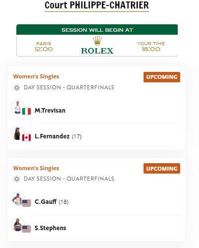 第一场女单1/4决赛将在今晚六点打响。特雷维桑目前保持一波红土九连胜,本届法网不失一盘。费尔南德斯连续两轮力克强敌, 她也是下半区所剩排名最高的球员,这是两位左手将职业生涯的首次交锋。 第二场女单1/4决赛将上演美国德比。高芙前四轮保持不失一盘的战绩,她将向生涯首个大满贯四强发起冲击。斯蒂文斯在晋级道路上有两场打出过连下12局的攻击波,她将力争第四次杀入大满贯半决赛。 双方此前唯一一次交锋是去年美网,当时斯蒂文斯两盘击败对手。 来源:WTA |
